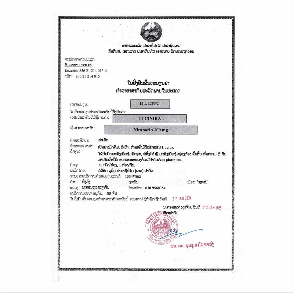 • for the maintenance treatment of adult patients with deleterious or suspected deleterious germline BRCA-mutated recurrent epithelial ovarian, fallopian tube, or primary peritoneal cancer who are in a complete or partial response to platinum-based chemotherapy. Select patients for therapy based on an FDA-approved companion diagnostic for LuciNira.