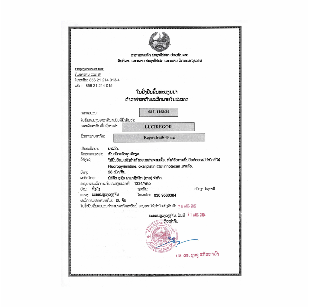 LuciRegor is a kinase inhibitor indicated for the treatment of patients with metastatic colorectal cancer (CRC) who have been previously treated with fluoropyrimidine-, oxaliplatin- and irinotecan-based chemotherapy, an antiVEGF therapy, and, if KRAS wild type, an anti-EGFR therapy.