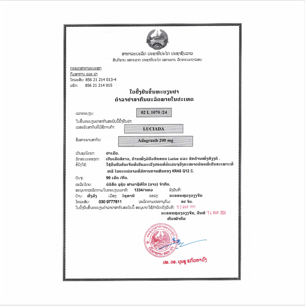 LuciAda is an inhibitor of the RAS GTPase family indicated for the treatment of adult patients with KRAS G12C-mutated locally advanced or metastatic non-small cell lung cancer (NSCLC), as determined by an FDA-approved test, who have received at least one prior systemic therapy.