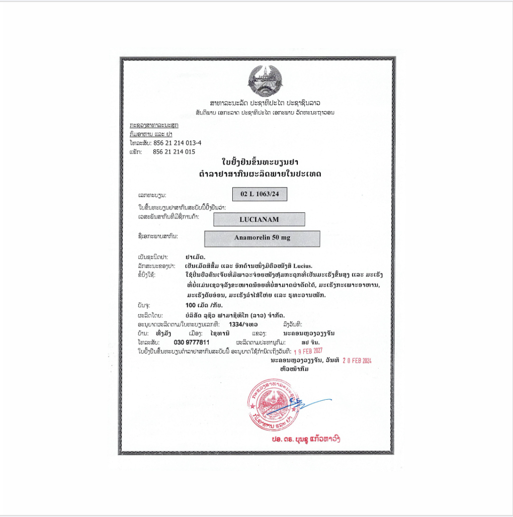 LuciAnam is used to treat cachexia patients with unresectable advanced and recurrent non-small cell lung cancer, gastric cancer, pancreatic cancer and colorectal cancer. For cancer cachexia patients with poor efficacy such as nutritional therapy. For patients who have lost more than 5% of their weight within 6 months with loss of appetite and meet the following criteria: