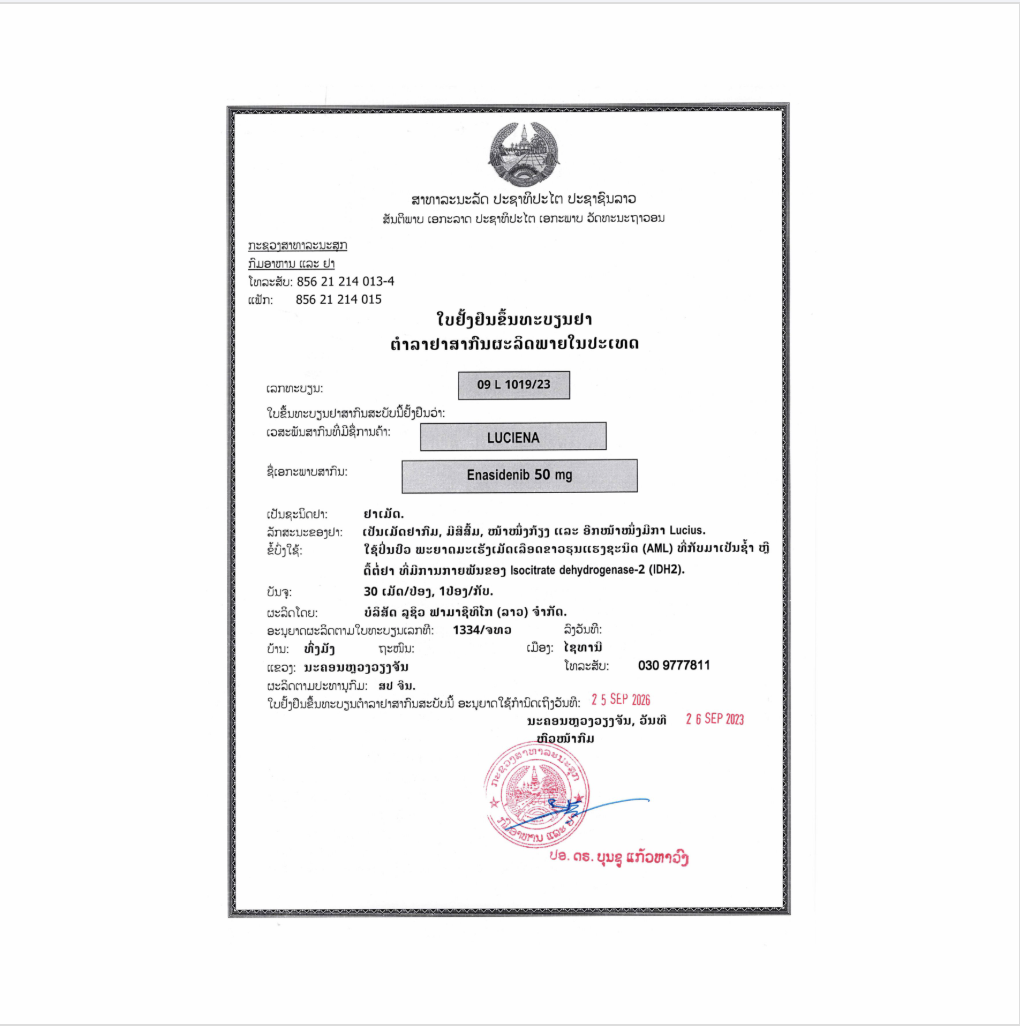 LuciEna is an isocitrate dehydrogenase-2 inhibitor indicated for the treatment of adult patients with relapsed or refractory acute myeloid leukemia (AML) with an isocitrate dehydrogenase-2 (IDH2) mutation.