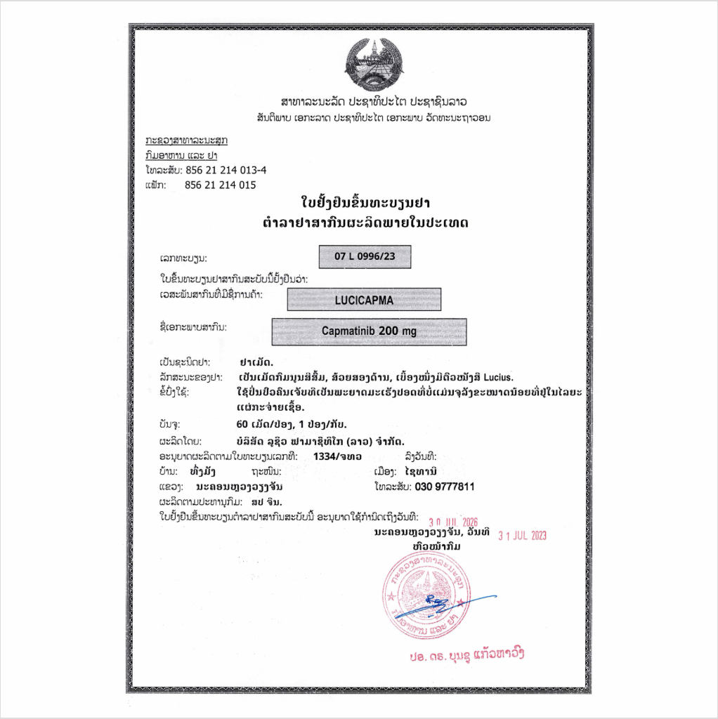 LuciCapma is a kinase inhibitor indicated for the treatment of adult patients with metastatic non-small cell lung cancer (NSCLC) whose tumors have a mutation that leads to mesenchymal-epithelial transition (MET) exon 14 skipping as detected by an FDA-approved test.