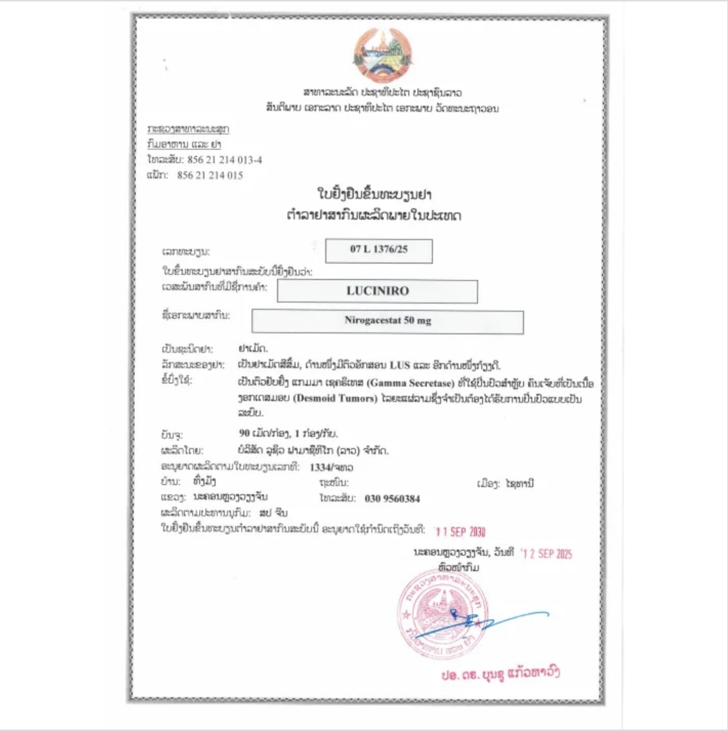 LuciNiro is a gamma secretase inhibitor indicated for adult patients withprogressing desmoid tumors who require systemic treatment.