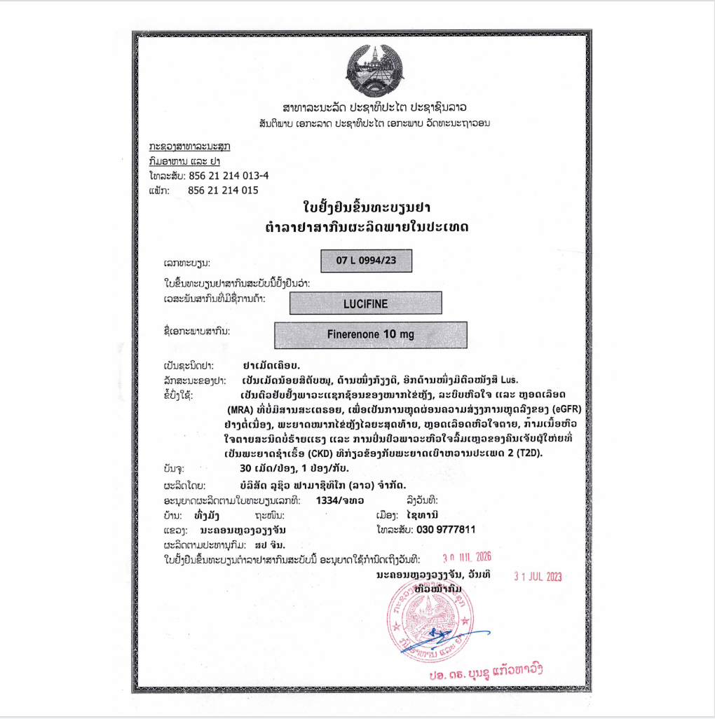 1、LUCIFINE(非奈利酮)是一种非甾体盐皮质激素受体拮抗剂(MRA),适用于降低患有与2型糖尿病(T2D)相关的慢性肾病(3期和4期,伴白蛋白尿)的成人患者持续eGFR下降、终末期肾病、心血管死亡、非致死性心肌梗死和心力衰竭住院的风险。