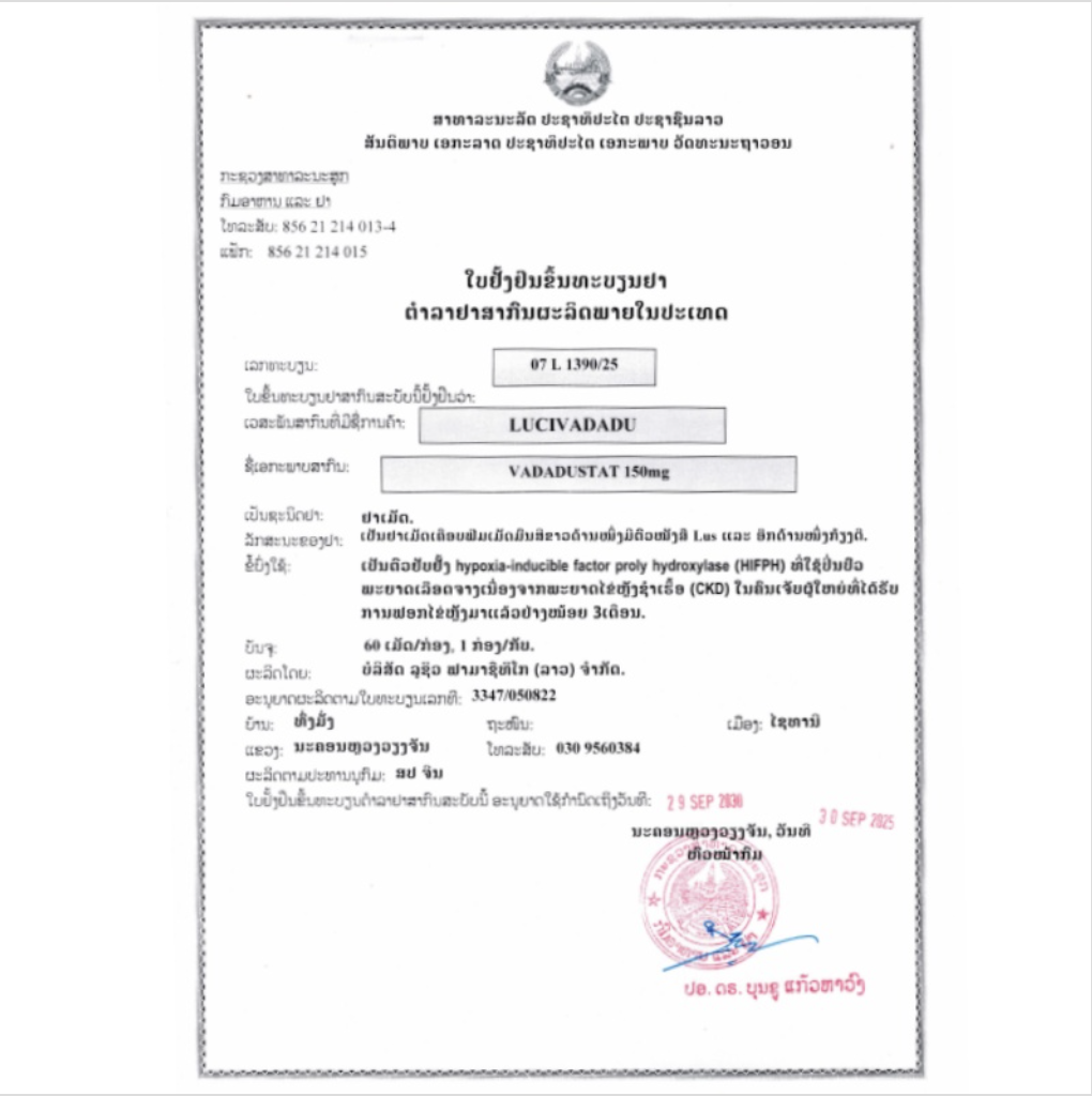 LuciVadadu 是一种缺氧诱导因子脯氨酰羟化酶 (HIF-PH) 抑制剂,适用于治疗已接受透析至少三个月的慢性肾病 (CKD) 成人贫血。