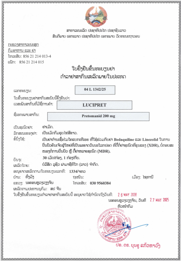 | 适应症 | 与贝达喹啉、利奈唑胺联用,治疗XDR-TB或难治性/不耐受MDR-TB |