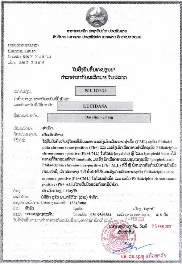 药理作用: 达沙替尼是一种强效的酪氨酸激酶抑制剂,可抑制BCR-ABL激酶(其活性异常是CML和Ph+ ALL的病因)。它对多种伊马替尼耐药突变形式的BCR-ABL激酶仍有活性。此外,它还能抑制SRC家族激酶等多重激酶。