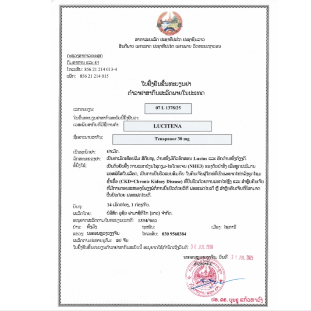 LuciTena是一种钠氢交换器3(NHE3)抑制剂,用于降低接受透析的慢性肾病 (CKD) 成人患者的血清磷,作为对磷酸盐结合剂反应不足或对任何剂量的磷酸盐结合剂疗法不耐受的患者的辅助疗法。