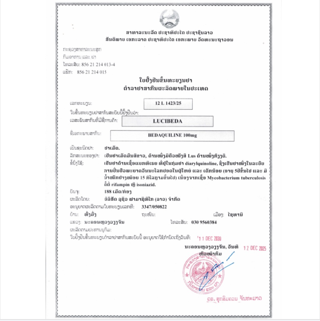 LuciBeda is a diarylquinoline antimycobacterial drug indicated as part of combination therapy in adult and pediatric patients (5 years and older and weighing at least 15 kg) with pulmonary tuberculosis (TB) due to Mycobacterium tuberculosis resistant to at least rifampin and isoniazid.