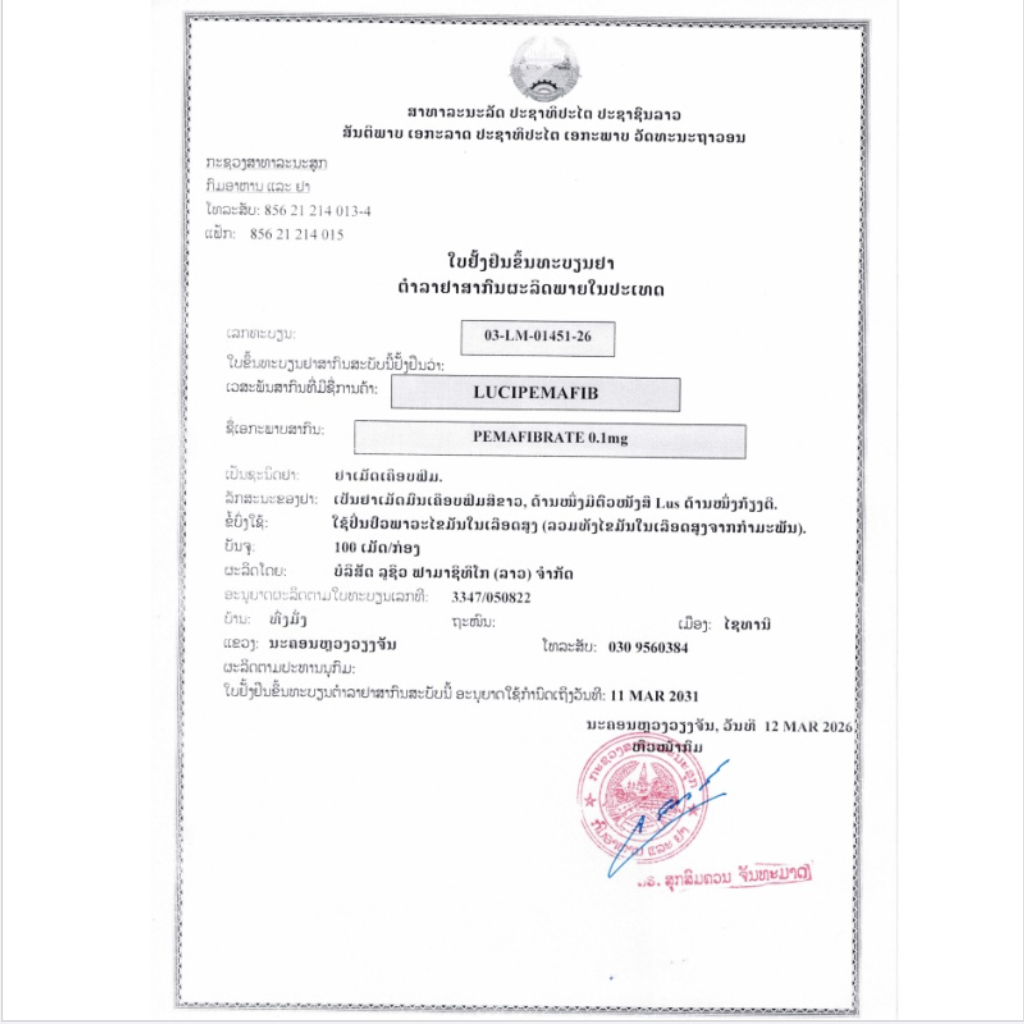 The usual adult dosage is 0.1 mg of pemafibrate administered orally twice daily, in the morning and evening. The dosage may be increased or decreased depending on age and symptoms, with a maximum dose of 0.2 mg administered twice daily.