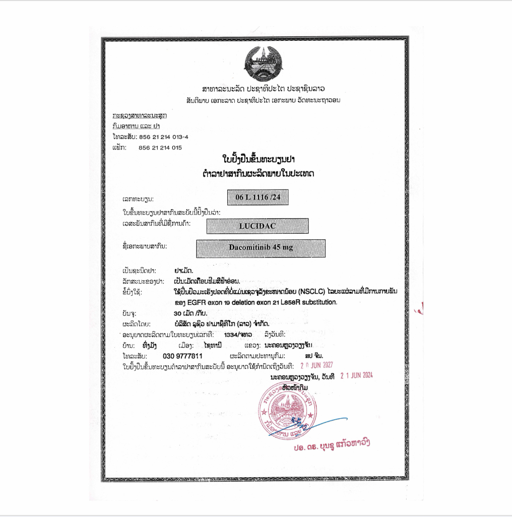 LuciDac是一种激酶抑制剂,用于经FDA批准的检测方法检测为表皮生长因子受体(EGFR)外显子19缺失或外显子21 L858R替代突变的转移性非小细胞肺癌 (NSCLC)患者的一线治疗。