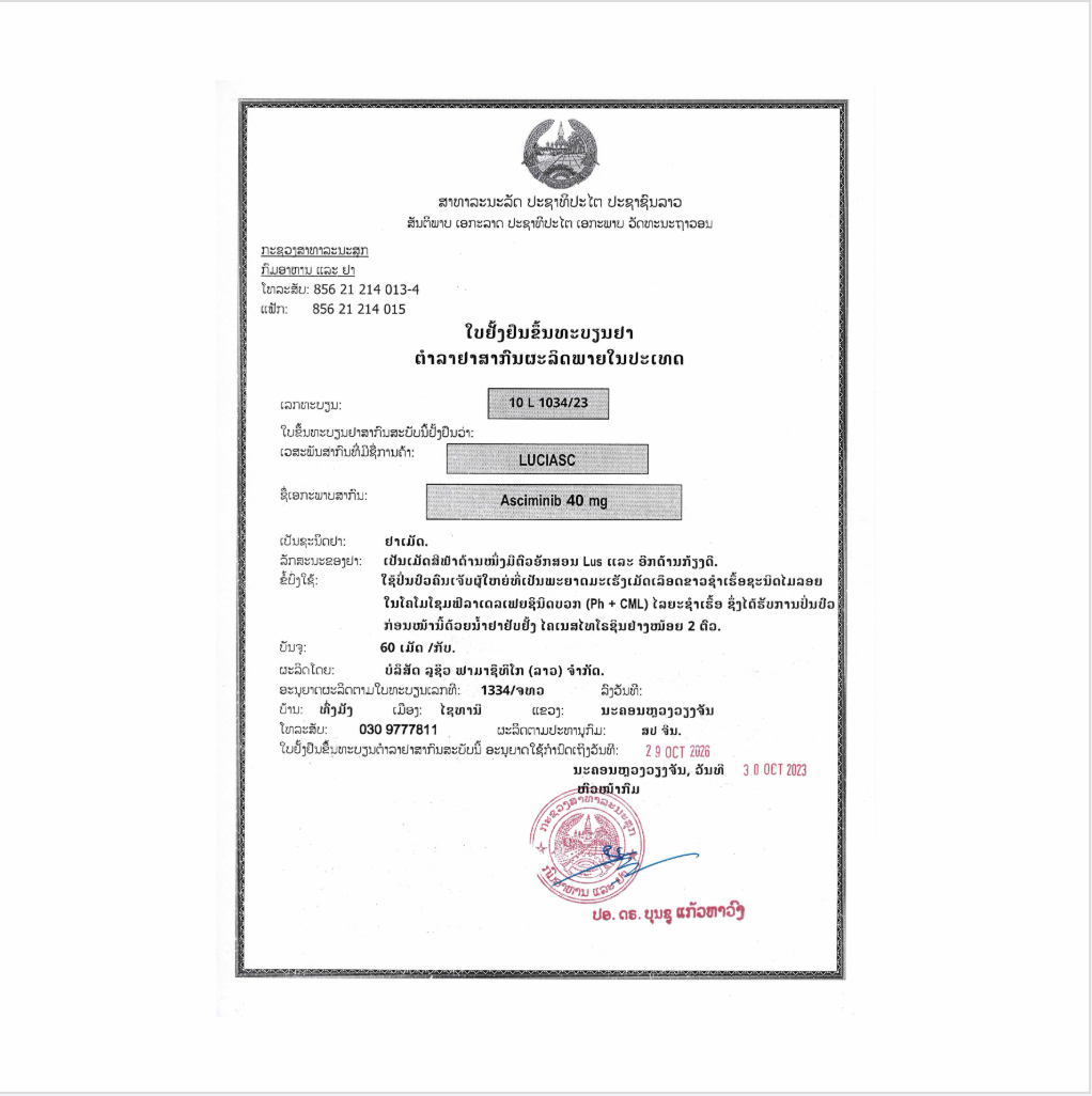 Asciminib的推荐剂量为200 mg,口服,每日两次,间隔约12小时。推荐剂量的Asciminib可在不进食的情况下口服。至少在服用Asciminib前2小时和服用Asciminib后1小时内避免进食。