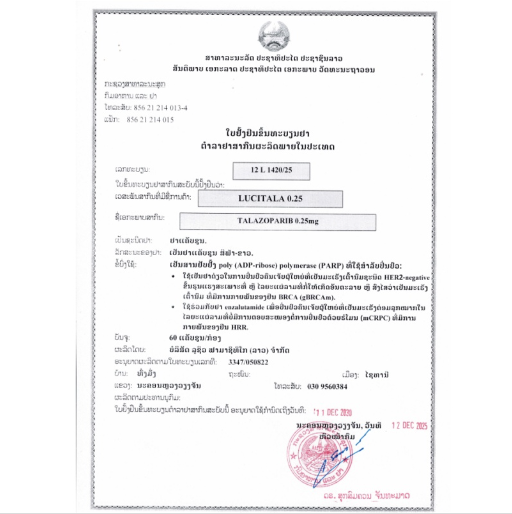 LuciTala 是一种聚(ADP-核糖)聚合酶 (PARP) 抑制剂,适用于: